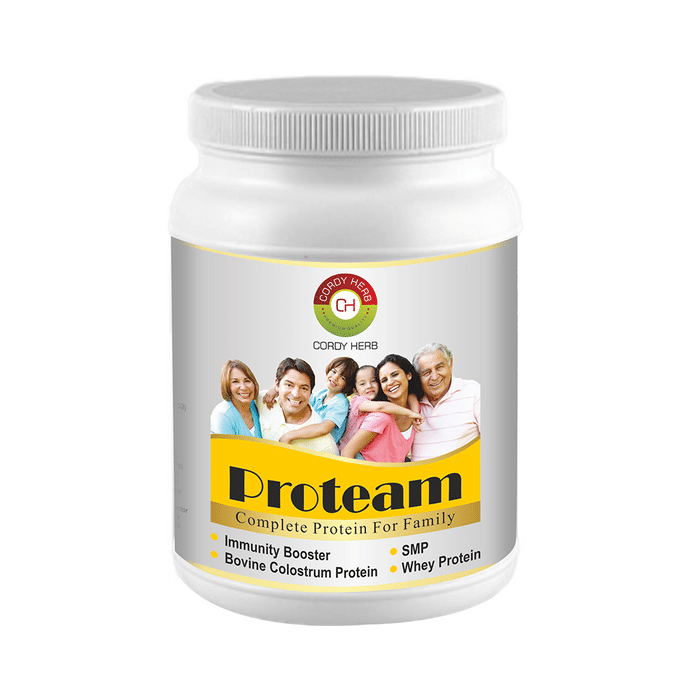 Cordy Herb Proteam A complete Family Protein Powder Bovine colostrum is a milky fluid that comes from cows in the first few days after giving birth before true milk appears. It contains protein, carbohydrates, fats, vitamins and minerals which can help fight disease-causing agents. Individuals of all age groups can benefit from this product. | Key Ingredients: Whey protein Sugar Cow colostrum powder Cocoa powder SMP | Key Benefits: It may help prevent gastrointestinal problems It can improve exercise performance It has a high concentration of a muscle-building protein called ‘casein’ which may support muscle development It may strengthen the immune system and support the body’s natural functions | Directions For Use: Take 2-3 scoops of the powder with milk or as directed by the physician. | Safety Information: Read the label carefully before use Store in a cool and dry place Keep out of reach of children