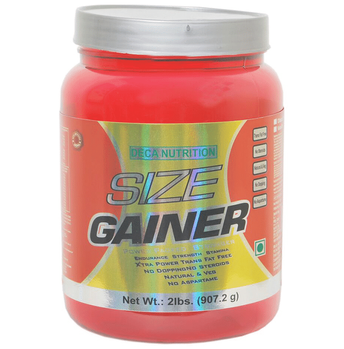 Deca Nutrition Size Gainer Chocolate Deca Nutrition Size Gainer is a 2lb chocolate flavoured weight gainer powder that helps in improving the stamina, power, energy level and boost body’s weight. This healthy and fat free size gainer powder is made up of pure vegetarian ingredients and is well recommended by the physicians to gain weight and stamina. Deca nutrition size gainer is free from trans-fat, doping or steroids and can be consumed by anyone once consulted by your health trainer or doctor.