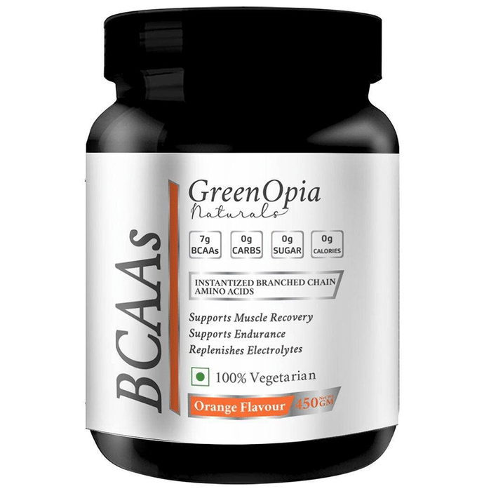 GreenOpia Naturals BCAAs Powder Orange GreenOpia Naturals BCAAs Powder Orange provides 7 grams of BCAAs per serving in the preferred 2:1:1 ratio of Leucine to Isoleucine and Valine which plays an essential role in the muscle building as they help to prevent protein catabolism and results in lean muscle mass. This formula also contains added L-Glutamine, L-Citrulline Malate, Vitamin B6 with Electrolytes and will deliver noticeable results in your bodybuilding, cross-fit, or powerlifting training. Improving amino acid uptake ability allows for faster and more efficient muscle tissue regeneration, which leads to stronger muscles, faster muscle repair and recovery. The essential amino acids leucine, isoleucine, and valine act as transport vehicles for faster absorption, which translates to faster post-workout recovery and better performance results. It also contains electrolytes for hydration to recover from a strenuous workout and help fight muscle breakdown during recovery. Branched-chain amino acids form more than 30% of compounds necessary for muscle growth. BCAAs are the only amino acids capable of increasing protein synthesis and providing glucose during muscle contractions. Besides, all GreenOpia Naturals products are manufactured in accordance with good manufacturing Practices (GMP), among the highest standards in the world. The product contains the most natural and effective formulation of trusted natural ingredients to ensure safety, efficacy, and purity.
