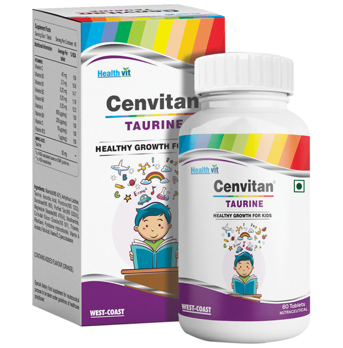 HealthVit Cenvitan Taurine Healthy Growth for Kids Tablet Healthvit Cenvitan Taurine is a dietary supplement for children, to improve their brain and eye development. Healthvit cenvitan taurine is for healthy growth for kids. Multivitamins and multi-minerals in cenvitan taurine are the needs of daily routine life.