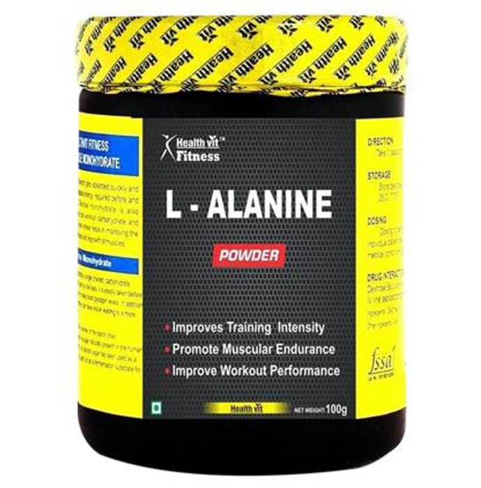 HealthVit Fitness L-Alanine Powder Healthvit Fitness L-Alanine powder contains l-alanine which is is a crystalline, free-form non-essential amino acid. It is is an excellent addition to your pre-workout energy drink and because it serves as muscular fuel for increasing power, strength and endurance for body builders and performance athletes. It may also help stabilize the blood glucose levels in people with hypoglycemia. Key benefits of Healthvit Fitness L-Alanine powder: It improves training intensity. It promote muscular endurance. It Improve workout performance. It stimulate the immune system. It acts as an inhibitory or calming neurotransmitter in the brain. It serves as muscular fuel for increasing power, strength and endurance for body builders and performance athletes. Direction of use: As a dietary supplement take 1 to 2 servings with your favorite beverage, between meals, or as directed by your physician. For strenuous exercise, take between 1.5 and 3 servings 30 minutes prior to your workout. Safety information: Diabetic patients, pregnant or lactating women and patients suffering from other diseases need to consult with a healthcare expert or dietician before consuming this product. Not recommended for children. Use under medical supervision.