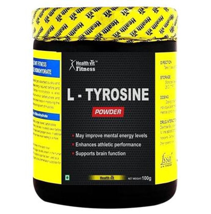 HealthVit Fitness L-Tyrosine Powder Healthvit Fitness L-Tyrosine powder contains l-tyrosine as its main ingredient. It is an essential amino acid which supports brain function. It can be converted by neurons in the brain into the neurotransmitters dopamine and norepinephrine (noradrenaline), hormones which are depleted by stress, excessive work and certain drugs. By replenishing norepinephrine in the brain, mental energy levels are enhanced and a feeling of contentment often occurs. It can also enhance athletic performance. It is an important component of protein and helps form the bioactive factors vital to cellular growth and maintenance. Key benefits of Healthvit Fitness L-Tyrosine powder: It improves mental energy levels. It enhances athletic performance. It supports brain function. Direction of use: As a dietary supplement, take 1 or 2 scoops mixed into your favorite beverage on an empty stomach or as directed by your physician. Safety information: Diabetic patients, pregnant or lactating women and patients suffering from other diseases need to consult with a healthcare expert or dietician before consuming this product. Not recommended for children. Use under medical supervision.
