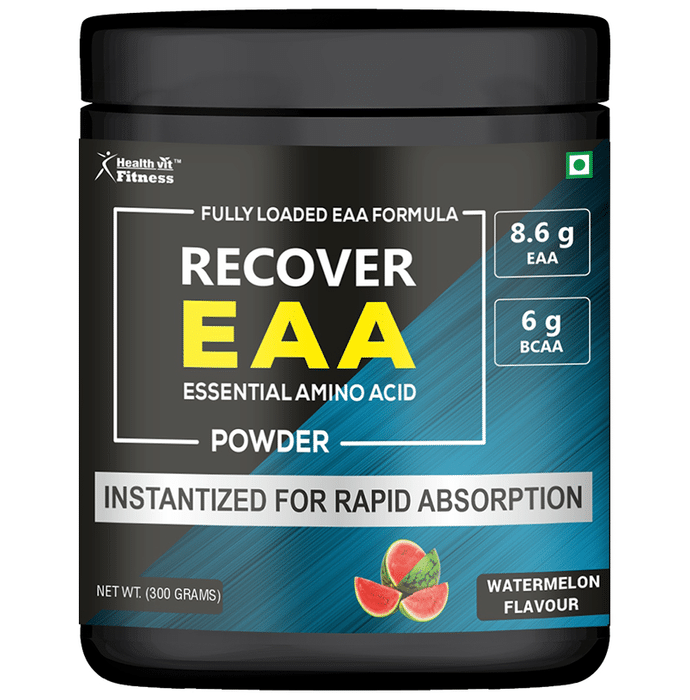 HealthVit Fitness Recover EAA Essential Amino Acid Powder Watermelon helps maximize lean muscle protein synthesis and promote recovery while increasing muscle growth and reducing exercise fatigue. It helps activate protein synthesis while reducing catabolic muscle breakdown. It supports strength and lean mass growth. It contains the nine essential amino acids; the human body cannot produce on its own. It has proper doses of these 9 EAAs, increases muscle protein synthesis, prevents muscle breakdown, enhances performance, improves metabolism and speeds up recovery. | Key Ingredients: L-Leucine L-Isoleucine L-Valine L-Lysine L-Threonine L-Histidine L-Methionine L-Tryptophan L-Phenylalanine | Key Benefits: It is designed to promote all-day focus, recovery, and hydration It supports improved brain function, mental acuity and memory, balances cortisol levels, and enhances power output and muscular contractions. It is the ultimate intra and intra-workout energy infusion It provides all of the essential amino acids required for muscle protein synthesis It helps maximize lean muscle protein synthesis and promote recovery while increasing muscle growth and reducing exercise fatigue | Directions For Use: Consume 1 scoop mixed with 16-24 oz. of water or your favourite beverages during exercise. On non-training days, consume 1 scoop any time of the day. Use daily for best results. | Safety Information: Store in a cool and dry place away from direct sunlight Read the label carefully Keep out of reach of children