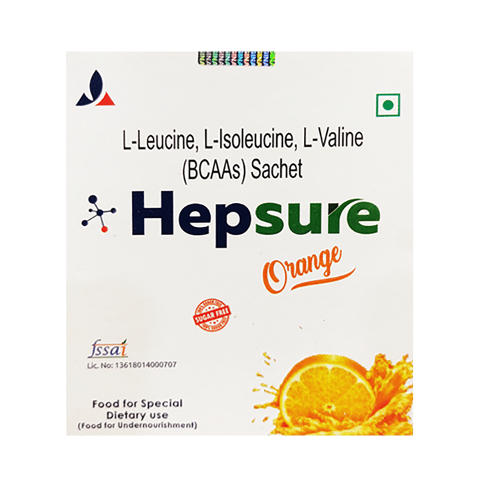 Hepsure Sachet Orange Sugar Free contains essential amino acids, used in the treatment of nutritional deficiencies. These amino acids work by increasing the production of certain chemicals in the body that improves blood flow to the muscles by widening the blood vessels and aiding in improving the growth of muscles. It is prescribed as a supplement for hypertension, diabetes(stimulates the release of growth hormone), pregnancy(maintains healthy foetal-maternal circulation). | Key Ingredients: L-Isoleucine L-Leucine L-Valine | Key Benefits: Hepsure aids in the normal growth development of muscles, connective tissues and skin and hence can be used for body building It boosts the energy levels and assists the body in recovering from strenuous physical activity Hepsure is used as a supplement to improve blood flow in patients with high blood pressure and maintains vascular and heart health | Directions For Use: Add one sachet in 200ml of water Stir well and consume immediately | Safety Information: Read the label carefully before use Do not exceed the recommended dosage Keep it away from the reach of children Store in a cool and dry place