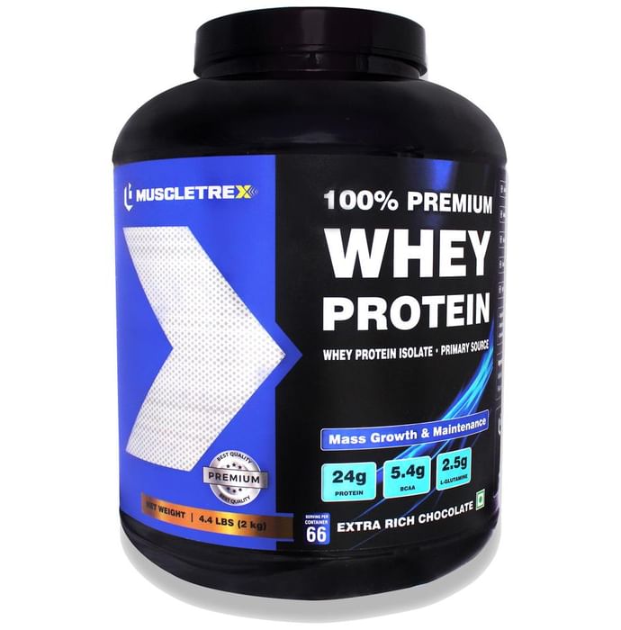 Muscletrex 100% Whey Protein Extra Rich Chocolate Muscletrex 100% Whey Protein has been developed by nutritional experts from the qualitative ingredient. It contains 100% whey protein with all the essential and non-essential amino acids to increase muscles growth after intense exercise of both short and long duration. This contains a blend of whey protein isolate, whey protein concentrate, branched chain amino acid (BCAA), L-arginine and L-Glutamine.