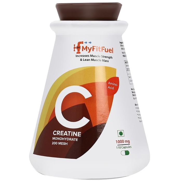 My FitFuel Creatine Monohydrate 200 Mesh 1000mg Capsule is formulated to promote muscle strength and power. The capsule aids in improving the overall workout energy and also helps to workout in more intense way. | Key Ingredients: Creatine Monohydrate 200 mesh Hydroxy Propyl Methyl Cellulose (INS 464) Capsule | Key Benefits: It assists in increasing strength and stamina for workout The capsule helps in endurance and strength training It helps in overall workout energy and helps to workout in more intense way It helps to achieve lean muscle mass Aids in ehancing muscle strength and power | Directions For Use: Take 3 capsules a day or as suggested by certified dietician Optimum amount of water (6-8 glass water a day) should be consumed while taking creatine | Safety Information: Read the label carefully before use Store in a cool dry place away from direct sunlight Keep out of reach of the children Use under medical supervision Do not exceed the recommended dose