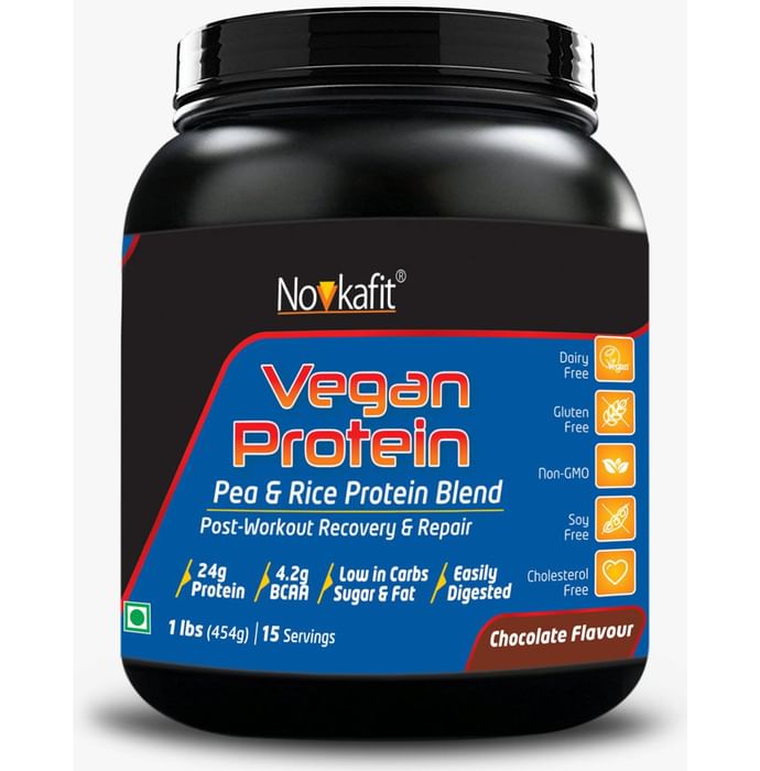 Novkafit Vegan Protein, Pea & Rice Protein Blend Chocolate Novkafit Vegan Protein, Pea & Rice Protein Blend Mango is a plant-based sports supplement that has been formulated to provide high quality protein for vegetarians, vegans or those intolerant to dairy products. A 100% Plant-Based Optimal vegan protein support that is lactose, gluten, soy & dairy-free. A Complete Serving Provides 24 g of high quality Pea & Rice Protein Isolates and 4.2 g of BCAAs (Branched-Chain Amino Acids) per serving essential for post-workout muscle recovery & repair.