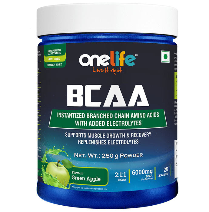 OneLife BCAA Powder Green Apple is a dietary supplement which can help provide nutrients essential for muscle performance. It is a blend of Essential Amino Acid blends and Branched Chain Amino Acids, which are necessary for quick recovery and growth of muscles. The supplement is free of sugar, carbs and fat. A drink that can help provide stamina vital in building lean muscles. | Key Ingredients: L-leucine L-isoleucine L-valine Electrolytes Sodium Potassium | Key Benefits: It helps improve stamina that is essential for workouts The presence of EAA and BCCAs aids in boosting instant energy It provides nutrition that aids in building muscles and improves strength It can assist in enhancing muscle repair and recovery and managing cell damage | Directions For Use: Use as directed in the label Shake well to dissolve completely Adjust the volume of water as per your taste | Safety Information: Self-medication is not advisable Store in a cool, dry place, away from direct sunlight Keep out of the reach and sight of children Do not exceed the recommended dosage