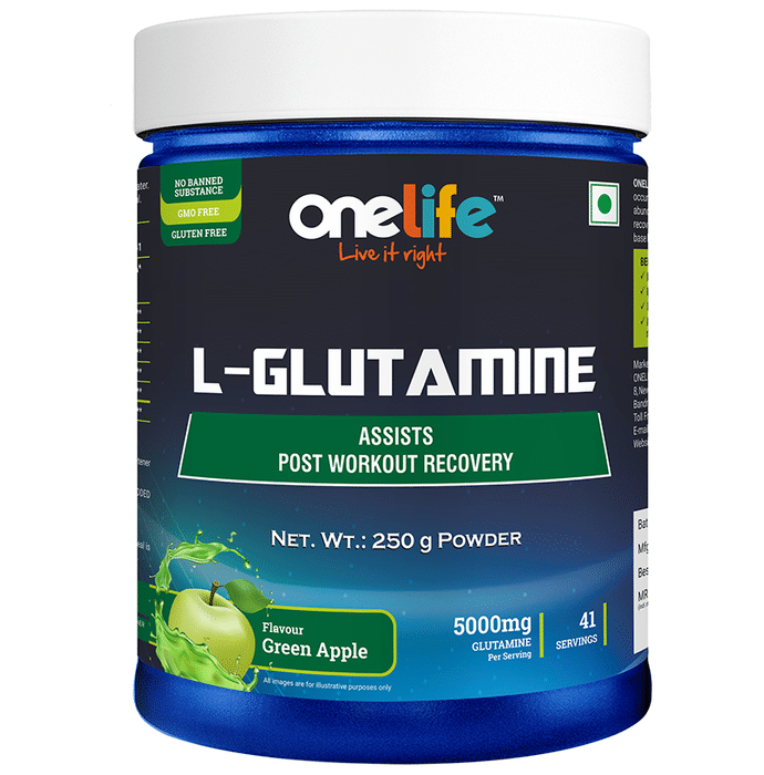 OneLife Glutamine Powder Green Apple OneLife Glutamine Powder is necessary for energy production in the body. It helps assist in post-workout recovery and is the best way to gain muscles by repairing them. Glutamine powder helps immune function fight diseases and supports acid-base balance. It acts as a gut barrier function and aids glutathione production, which is the most abundant amino acid found in human plasma and skeletal muscle. It has great tasting green apple flavour and aids muscle recovery so you are ready to build another day!