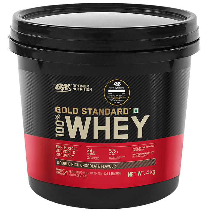 Optimum Nutrition (ON) Gold Standard 100% Whey Protein Powder Double Rich Chocolate contains a blend of whey protein isolate and whey protein concentrate. The powder is instantized for easy mixing using just a glass and spoon. It comes in a mouth watering chocolate flavour to add taste to your workout routine. | Key Ingredients: Whey protein isolate | Key Benefits: Provides protein in every serving to support muscle-building needs after training It helps in strengthening the muscles It helps build endurance and supports faster recovery More than 5 grams of naturally occurring BCAAs, branched-chain amino acids: leucine, isoleucine, and valine, in each serving It comes in a delectable Double Rich Chocolate flavour | Good to Know: Vegetarian and gluten free | Protein per Serving: 24 grams per serving. | Product Form: Powder | Directions for Use: Combine 180 - 250ml of water or your favourite beverage with one scoop of this protein powder and stir. | Safety Information: Read the label carefully before use Keep out of reach of children Store in a cool, dry place away from direct sunlight