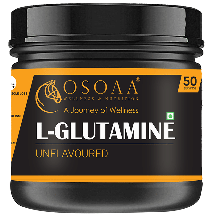 OSOAA L-Glutamine Unflavored L-Glutamine is the most abundant amino acid in the blood muscle cells. It is an essential amino acid which can prevent muscle breakdown during intense workouts. It can help improve immunity, gastrointestinal support function, and muscle protein synthesis. | Key Ingredients: L-Glutamine | Key Benefits: This workout supplement can help reduce muscle loss It may aid in boosting the immune system It can enhance protein synthesis | Directions For Use: 5gm per serving 1 serving in one day after workout | Safety Information: Lactating or pregnant women and people with any medical condition should consult a physician before consuming this product. Keep out of reach of children Do not exceed recommended daily usage Store in a cool and dry place