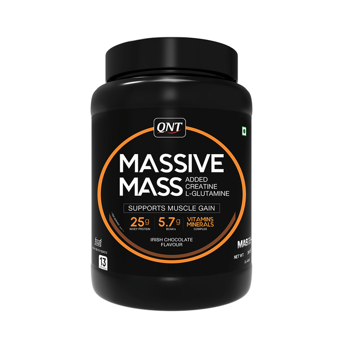 QNT Massive Mass Irish Chocolate contains both whey protein and carbohydrates that are designed to fuel intense workouts and maximise recovery. It helps to gain weight and build muscle mass. | Key ingredients: Whey protein concentrated Diluent L glutamine Di calcium Other vitamins and minerals Key Benefits: It helps to meet your daily protein requirements It helps you to maintain an active lifestyle It promotes muscle building and induces muscle gain It helps in postworkout recovery | Directions For Use: Mix one serving scoop in 250-300 ml water Shake it all to avoid the formation of lumps Consume it after workouts, between meals, or before bedtime for maximum results | Safety Information: Read the label carefully before use Keep out of reach of the children Store in a cool dry place