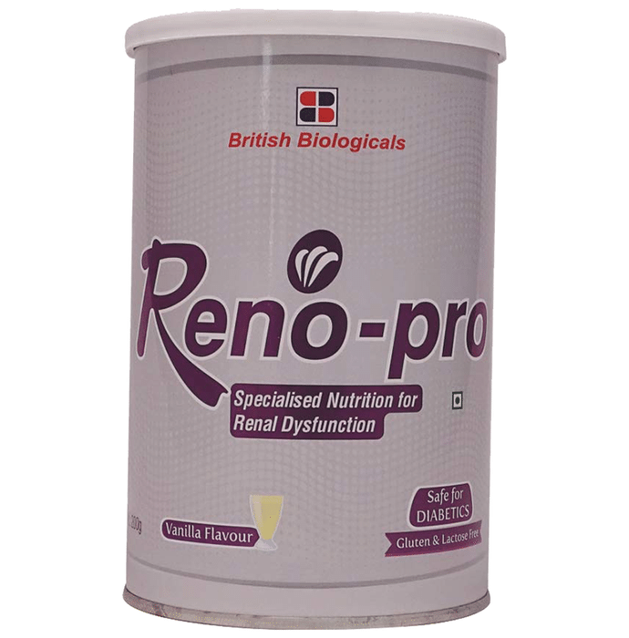 Reno-pro powder is a calorie dense nutritional supplement that contains the goodness of Whey Protein Concentrate, Soya Protein Isolate, Maltodextrin, Protein and Amino acids, and other essential nutrients. Whey Protein Concentrate and Soya Protein Isolate combine to deliver required proteins to the body lost during the dialysis process. Maltodextrin is a rich source of carbohydrates. Reno-pro powder is designed for patients with chronic kidney disease stage 5 or patients maintained on dialysis. Benefits of Reno-pro powder: Low electrolyte content reduces edema Helps control blood pressure Reduces the risk of CV complications due to hyperkalemia Low phosphorous levels reduce the risk of hyper-phosphatemia.