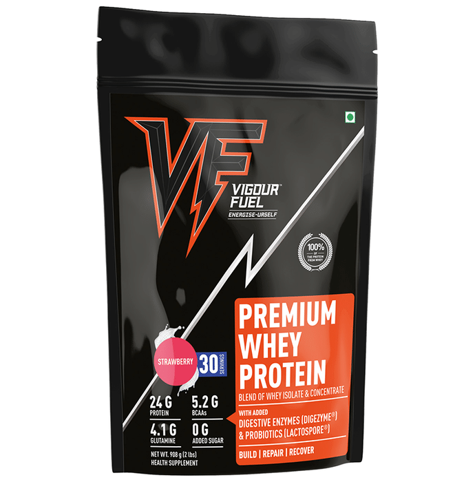 Vigour Fuel 100% Pure Whey Protein Premium Strawberry Shake Vigour Fuel 100% Pure Whey Protein Premium is designed with natural occurring all essential & non-essential amino acids. These amino acids are rapidly delivered to the target muscles where they immediately get to work to encourage muscle growth and repair through protein synthesis and therefore helps to recover quicker and build muscle more effectively. In addition to this, it comes in seven different flavours namely, Strawberry Shake, French Vanilla, Banana Smoothie, Milk Toffee, Mint Chocolate, Dutch Chocolate, and Unflavoured.