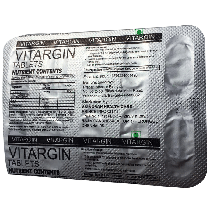 Vitargin Tablet It is a dietary supplement formulated with an essential amino acid, L-Arginine, that supports the immune and cardiovascular systems. L-Arginine is a crucial factor in muscle metabolism and is a precursor for nitric oxide, which increases circulation by relaxing blood vessels. | Key Ingredients: L-arginine | Key Benefits: It is a dietary supplement formulated with an essential amino acid, L-Arginine, that supports the immune system and cardiovascular system L-Arginine is a crucial factor in muscle metabolism and is a precursor for nitric oxide, which increases circulation by relaxing blood vessels It also enables the body to recover and detoxify after a workout It reduces the risk of infections, improves immunity and speeds up recovery It helps to fight against free radicals and reduces inflammation It also helps the body to get rid of ammonia (a waste product) and stimulates the release of insulin | Directions For Use: Use as directed on the product label or your physician | Safety Information: Read the product label carefully before use Store in a cool and dry place away from direct sunlight Keep out of reach of children Consult a doctor before taking any supplement Do not exceed the recommended dosage Pregnant or nursing mothers, children, and people with medical conditions must consult a physician before taking this supplement