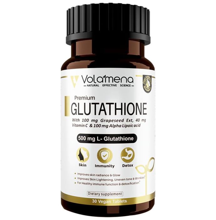 Volamena Premium Glutathione Vegan Tablet is a dietary supplement which can help improve skin radiance and make the skin glow. It may support immune function and detoxification. | Key Ingredients: L-Glutathione Vitamin C Alpha Lipoic acid | Key Benefits: L-Glutathione can help detoxify and brighten the skin Vitamin C may aid in better absorption of glutathione Alpha lipoic acid can reduce free radicals and improve glutathione levels These tablets can help improve immunity | Directions For Use: Use as directed on the label or by a healthcare professional. | Safety Information: Pregnant or lactating women and individuals with known medical conditions or taking medications should consult the medical practitioner before consuming this product In case of accidental overdose, consult a physician Read the label carefully before use Store in a cool and dry place Keep out of reach of children