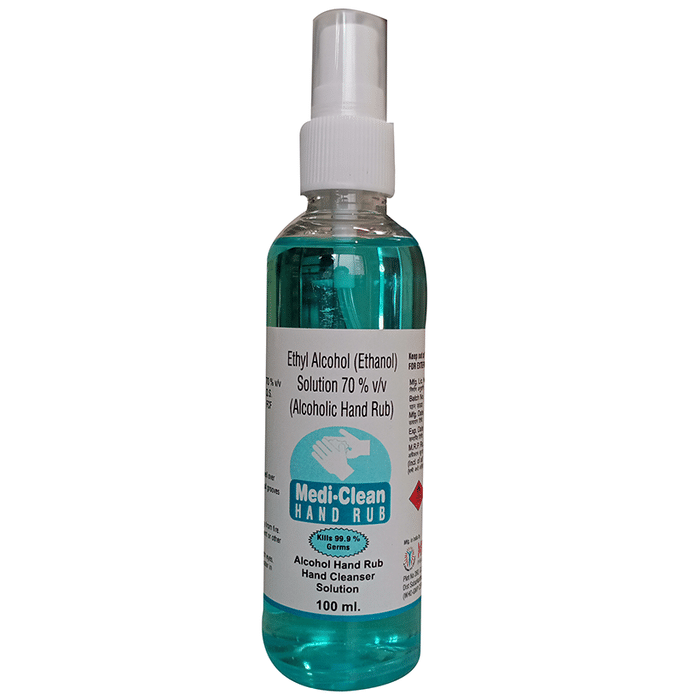 Medi-Clean Hand Rub Sanitizer contains 70% alcohol that kills 99.9 % of germs instantly and is extremely effective against bacteria and viruses. | Key Ingredients: Alcohol: 70% | Key Benefits: Instantly kills 99.9% germs without the use of soap and water It does not make the skin feel dry and keeps it moisturised Dries swiftly and ensures hygiene | Directions For Use: Use as directed. | Safety Information: Read the label carefully before use Keep out of reach of the children Store in a cool dry place