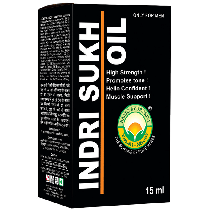 Basic Ayurveda Indri Sukh Oil It has been demonstrated to relieve stress and fatigue, increase stamina, and enhance blood circulation. It can also reduce weakness, manage performance issues and helps improve vigour and vitality. | Key Ingredients: Indrjav Kamal beej Jaiphal Badi kateri Sudh bhilava | Key Benefits: It might help improve vigour and vitality It helps to manage performance issues, and increases strength It also helps to boost your stamina and improves your libido levels | Directions For Use: Use as directed on the label or as advised by your healthcare provider. | Safety Information: Read the label carefully before use Store in a cool and dry place away from direct sunlight Keep out of reach of children