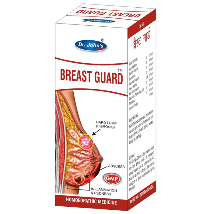 Dr. Johns Breast Guard Drop contains a blend of herbs and other natural ingredients that help to maintain and build fuller, firmer and uplifted breasts and rejuvenates the support structure of the skin. | Key Ingredients: Apis Mellifica Barium Chloride Belladonna Calcarea Iodatum Hepar Sulphur Kali Bichromicum Mercurius Sulphuricus Cor. Phytolacca | Key Benefits: Helps in making the breast firmer, tighter, enlarged and uplifted Helpful in breast development Strengthens breast muscles and makes them strong May help to make the breasts curved in appearance | Directions For Use: 10-15 drops 3 times a day, in some water, one hour before meals. | Safety Information: For external use only Read the label carefully before use Do not exceed the recommended dose Keep out of the reach of children Store in cool and dry place Should be protected from direct light