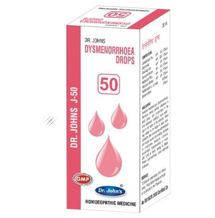 Dr. Johns J-50 Dysmenorrhoea Drop is a homeopathic preparation given in the form of drops. These drops are indicated for the management of dysmennhorea and reduction of pain during menstrual cramps. Key Ingredients: Caulophyllum Tha Chamomilla Cimicifuga Rac Cuprum Aceticum Magnesium Phos Viburunum Opulus Purified water Alcohol content Key Benefits: The drops are used for the management of dysmennhorea which is also accompanied by menstrual cramps It also helps to manage the pain radiating in the lower abdominal or the umbilical or right or left region of the abdomen which may radiate to the thighs and lower back as well The menstrual pain is often associated with other common symptoms such as nausea and vomiting followed by diarrhea and constipation and headache The drops are purely herbal in formulation Directions For Use: Take Dr. Johns J-50 Dysmenorrhoea Drop as directed by the physician As directed, one can take 10 drops in some water, 3 to 4 times a day It is suggested to be taken 1 hour before taking meals Safety Information: Read the label carefully before use Keep out of the reach of children Do not exceed the recommended dose Avoid alcohol consumption If pregnant or breastfeeding, make sure you consult your homeopathic practitioner before use