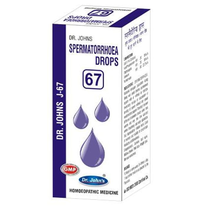 Dr. Johns J-67 Spermatorrhoea Drop is a homeopathic preparation given in the form of drops. These drops are indicated for the treatment and management of Spermatorrhoea which is accompanied by nocturnal emissions . Key Ingredients: Acid Phosphoricum Staphysagaria Selenium Purified water Key Benefits: Used for the management of Spermatorrhoea followed by nocturnal emissions The drops are found to be effective against impotency and early ejaculation which is followed by dull, depressed and irritable mood as well Beneficial in treating and managing symptoms such as ejaculation or drooling of semen without any sexual event/erection/ orgasm Directions For Use: Take Dr. Johns J-67 Spermatorrhoea Drop as directed by the physician As directed, one can take 10 drops in some water, 3-4 times a day It is recommended to take the drops 1 hour before the meals Safety Information: Read the label carefully before use Keep out of the reach of children Do not exceed the recommended dose Avoid alcohol consumption If pregnant or breastfeeding, make sure you consult your homeopathic practitioner before use