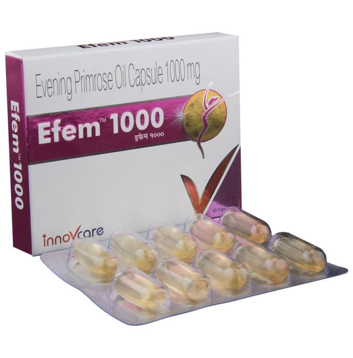 Efem 1000mg Capsule Efem 1000 Capsule contains Evening Primrose Oil as a major ingredient.Evening Primrose Oil is an excellent source of the specific omega 6 fatty acid called gamma-linolenic acid (GLA), which helps reduce inflammation during menstruation, thus reduces the pain associated with breast tenderness and menstrual cramps.