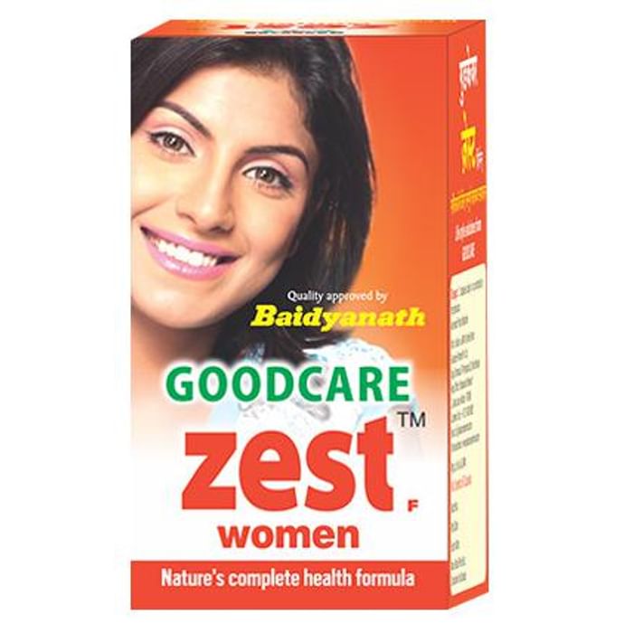 Goodcare Zest Women Capsule is a herbal formula made for women. It maintains physical and mental health. It also enhances immunity and helps to enjoy a better quality of life with excellent cycle control & blood purification. | Key Ingredients: Aswagandha (Withania somnifera) Lodhra (Symplocos racemosa) Ashok (Saraca indica) Shatavari (Asparagus racemosus) Bansalochan (Bambusa arundinacea) Lauha Bhasma Bhringaraj (Eclipta alba) Neem (Azadirachta indica) Haritaki (Terminalia chebula) Giloy (Tinospora cordifolia) | Key Benefits: It consists of ingredients that help rejuvenate the body and acts as a very good antioxidant The capsule also helps in enhancing immunity and supports the power of memory retention This capsule helps regulate menstrual cycle It also acts as an aid in keeping skin, hair and nails in good health It recharges the body's vigour and vitality It helps maintain liver & kidney functions | Directions For Use: Take Goodcare Zest Women Capsule as directed by the physician. | Safety Information: Read the label carefully before use Do not exceed the recommended dose Keep out of the reach of children Store in cool and dry place Should be protected from sunlight