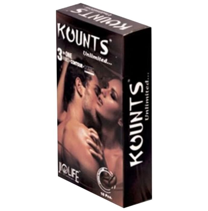 Kounts Condom is a multi texture condom. It reduces the risk of unwanted pregnancy and sexually transmitted diseases. | Uses: Rubber latex condom | Salient Features: Condoms help in safe love making Prevents the spread of sexually transmitted diseases They act as a birth control method | Directions For Use: Put the condom on the erect genital just before indulging in sexual activity The rolling direction should be on the outside. If the roll is on the inside it indicates that the condom is inside out which should not be used Must squeeze the end of the condom before putting it on to release any air trapped inside While squeezing the end with one hand, put the condom on top of the genital and roll it with the other Once ejaculation is reached and while the genital is still erect, hold the condom firmly and take it off carefully to avoid any spillovers | Safety Information: Read the label carefully before use If condom comes off during sexual intercourse, do not use the same condom again. Always use a fresh condom Keep out of the reach of children