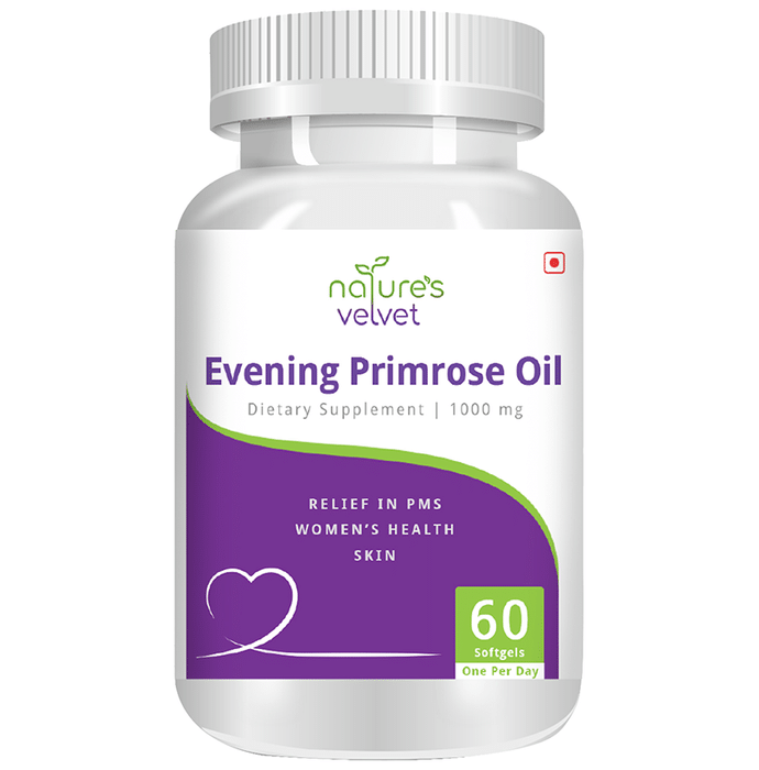 Nature's Velvet Evening Primrose Oil 1000mg Softgel Nature's Velvet Evening Primrose Oil 1000mg capsule contain calories from fat, polyunsaturated fat, monounsaturated fat, evening primrose oil, gamma-linolenic acid (GLA). Key benefits of Nature's Velvet Evening Primrose Oil 1000mg capsule: It is used for skin disorders such as eczema, psoriasis, and acne. It is also used for rheumatoid arthritis, weak bones(osteoporosis), cancer, high cholesterol, heart disease, a movement disorder in children (dyspraxia), leg pain due to blocked blood vessels, alcoholism, Alzheimer’s disease, and schizophrenia. Direction to use: Take 1 capsule with lukewarm water 2-3 times a day or as suggested by the healthcare professional. Safety information: Pregnant, nursing women or individual taking any medications, consult the doctor before use. Use under medical supervision.