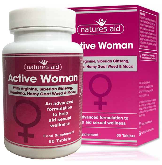 Natures Aid Active Woman Tablet is an advanced formulation to help aid sexual wellness for a woman. It can help to support the proper functioning of the reproductive system. It improve desire and excitement in women and strengthens the reproductive system. | Key Ingredients: Arginine Siberian ginseng Damiana Horny goat weed Maca | Key benefits: It helps in improving sexual performance and enhances the functioning of the reproductive system of women It helps to improve desire and excitement in women and strengthens the reproductive system It may help to fight against common transmitted diseases It is an advanced formula that helps to aid sexual wellness in women | Direction For Use: As directed by the physician | Safety Information: Keep away from direct sunlight Store in a cool and dry place Keep out of the reach of children Read the label carefully before use