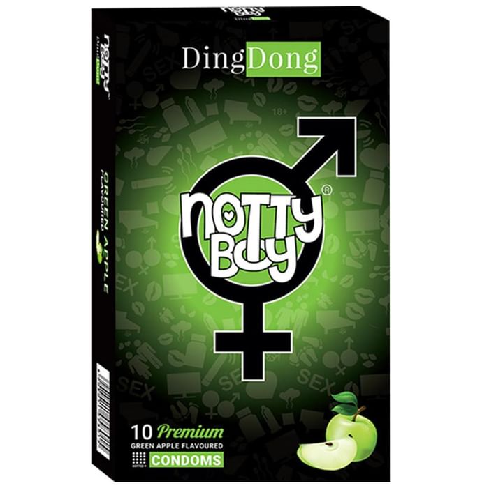 Notty Boy Ding Dong Green Apple Condom NottyBoy Flavoured Dotted Condoms made from natural rubber latex helps in enhancing the pleasure levels to the max by providing unique dotted design, reservoir tip and rich green apple flavour. They are lubricated for a comfortable natural feeling. Reservoir tip provide added comfort and safety.