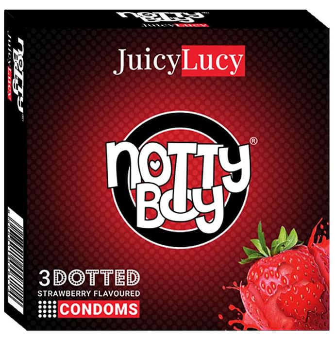 NottyBoy JuicyLucy Flavoured Dotted Condoms made from natural rubber latex helps in enhancing the pleasure levels to the max by providing unique dotted design, reservoir tip and rich strawberry flavour. They are lubricated for a comfortable natural feeling. Reservoir tip provides added comfort and safety. | U | Uses This product is designed to prevent pregnancy and give protection against sexually transmitted diseases. | Product Specification and Features: Made with natural rubber latex and 100% medical-grade silicone oil Comes in a special and easy-to-use disposal pouch Lubricated, transparent and teat ended shape It has been rigorously tested against breakage Provide perfect lubrication and a pleasurable fit Condom Size: Length 180 mm (min) Width: 53 ±2 mm The condoms have improved smell, flavour and give an intimate experience | Directions For Use: Just before indulging in sexual intercourse put the condom on the erect genital The roll should be on the outside The end of the condom must be squeezed before putting it on to release any air trapped inside While squeezing the end with one hand, one should put the condom on top of the genital and roll it with the other Once ejaculation is reached, and while the genital is still erect, hold the condom firmly and take it off | Safety Information: Read the label carefully before use Keep out of reach of the children Avoid physical damage This product is for single use only Protect from heat and direct sunlight Store the condoms in a cool and dry place Always use a fresh condom during intercourse Do not use a condom after the expiry date indicated on the pack
