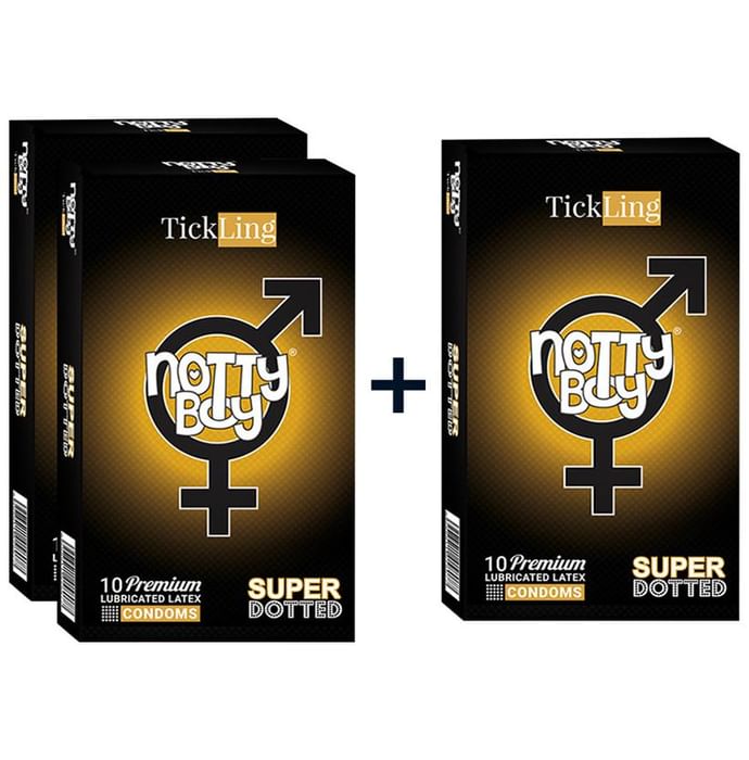 Notty Boy Super Dotted Tick Ling Condom Buy 2 Get 1 Free (10 Each) Notty Boy Condom made from natural rubber latex gives you the most intense sensations and natural feeling to you and your partner. NottyBoy SuperSlim condoms help in enhancing the pleasure levels to the max by providing an extra-thin wall.