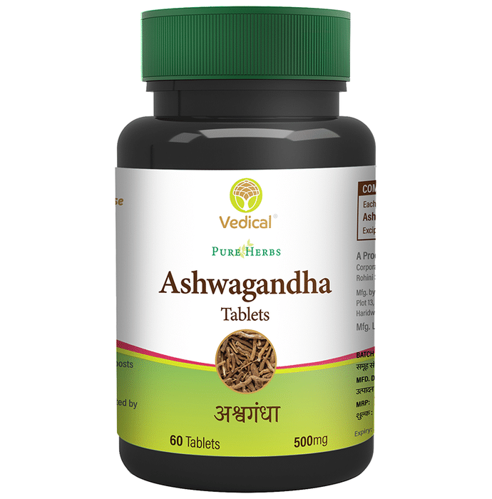 Vedical Ashwagandha Tablet is enriched with the goodness of Ashwagandha, which has various health benefits. It is effective in reducing stress and anxiety. It may help in the management of vigour and vitality. It calms down the body and provides relief from fatigue. It is enriched with antioxidants and protects from damage caused by oxidative stress. | Key Ingredients: Ashwagandha | Key Benefits: It promotes sleep and helps to deal with stress Helps to balance the nervous system Restores energy and strength Helps to delay the appearance of signs of ageing | Directions For Use: 1-2 tablets per day or as directed by the physician. | Safety Information: Read the label carefully before use Keep out of reach of the children Store in a cool dry place