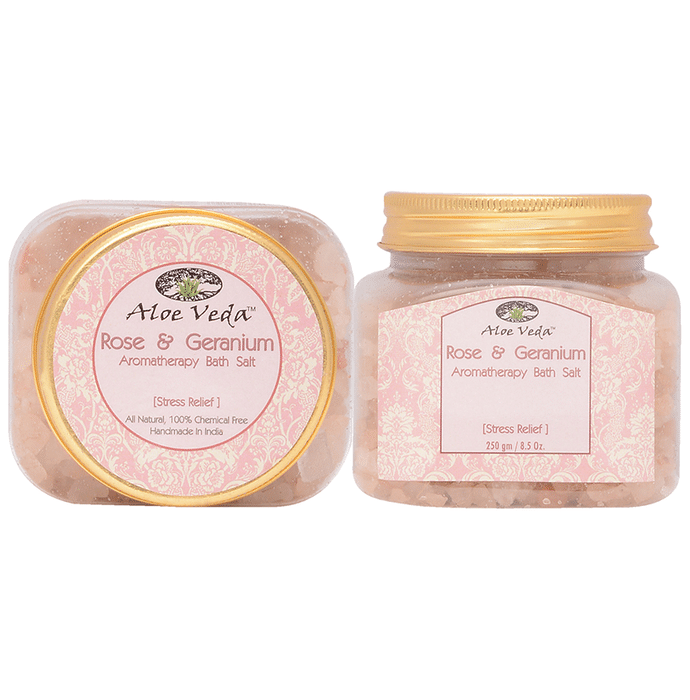 Aloe Veda Rose and Geranium Aromatherapy Bath Salt Aloe Veda Aromatherapy Bath Salt Peppermint contains pure Himalayan salt, which possesses multiple beneficial minerals, and is blended with essential oils, known to detoxify the body and serves as aromatherapy.