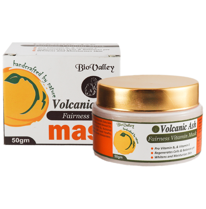 Bio Valley Volcanic Ash Fairness Vitamin Mask is a natural fairness vitamin mask. Enriched with pro-vitamins it helps in moisturizing and nourishing your skin. It helps in regenerating skin cells and also balances PH level of the skin. Natural ingredients help in detoxification of skin and also restores skin vibrancy. It is suitable for all skin types and is safe to use. | Key Ingredients: Volcanic Ash Gotu kola Extract Avena sativa Sweet Almond oil Vitamin E Pro Vitamin B5 Butyalated Hydroxy Multani Mitti | Key Benefits: Nourishes your skin Helps in repairing and regeneration of cells Detoxifies skin Improves complexion of skin Has anti-ageing properties Hydrates dry skin cells | Directions For Use Using fingertips, apply a thin even layer over clean skin, avoiding the eye area. leave for 10 minutes then rinse with water and pat dry. use once a week or as needed on stressed or ageing skin | Safety Information: Read the label carefully before use Keep out of the reach of children Use under medical supervision For external use only Store in a cool and dry place Keep away from the direct sunlight