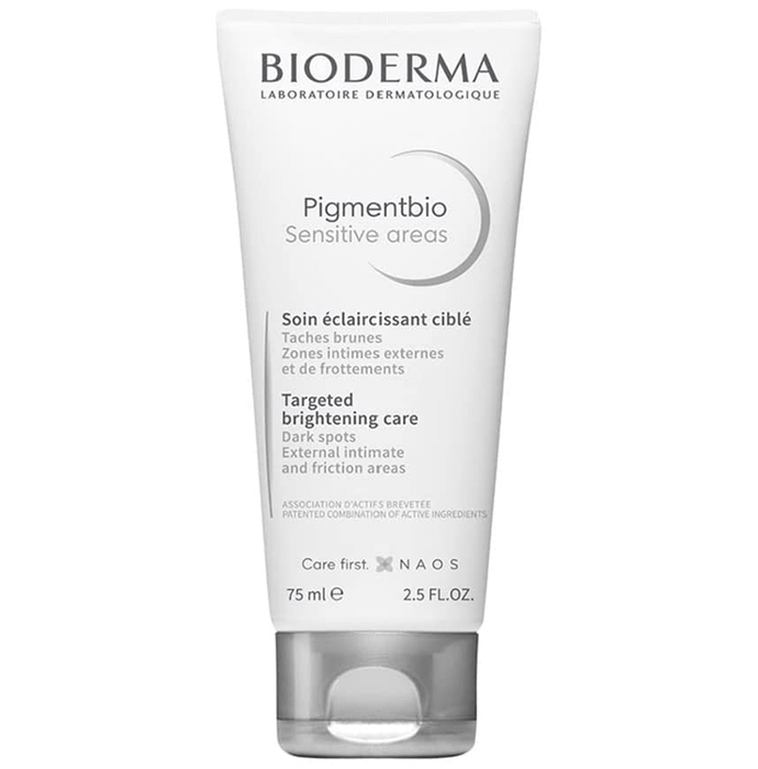 Bioderma Pigmentbio Sensitive Areas Cream Bioderma Pigmentbio Sensitive Areas Cream is a care product designed to effectively address uneven skin in delicate and intimate areas. This product contains a patented combination of active ingredients recognised for their depigmenting action: andrographolide, lysine azelate and glabridin. These active ingredients can regulate the biological mechanisms that cause uneven skin for optimum brightening and preventive efficacy. Pigmentbio sensitive areas thus may help brighten and even out areas of friction (knees, elbows, neck, underarms, thighs, and groin) and external intimate areas. In addition to this patented combination of active ingredients, this product contains a golden seaweed extract (laminaria ochroleuca) that may help soothe irritated, sensitive areas and prevent redness, which can also cause skin colour variations.