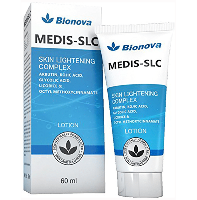 Bionova Medis-SLC Skin Lightening Complex is a light-scented cream with a silky texture. It calms your skin while also hydrating and brightening it. It is a thin, non-greasy ayurvedic face cream that easily absorbs into the skin, hydrating it without making it appear oily. | Key Ingredients: Arbutin Kojic acid Glycolic acid Licorice Octyl methoxycinnamate | Key Benefits: This cream helps to lighten hyperpigmentation, dark spots and blemishes and evens out skin tone naturally This cream acts on melanin-producing cells to make the skin tone lighter It helps in brightening properties of this cream due to its potent ingredients This cream is known to add radiance and glow to the skin | Directions For Use: Use as directed on the label or as advised by your healthcare provider. | Safety Information: Read the label carefully before use Store in a cool and dry place away from direct sunlight Keep out of reach of children