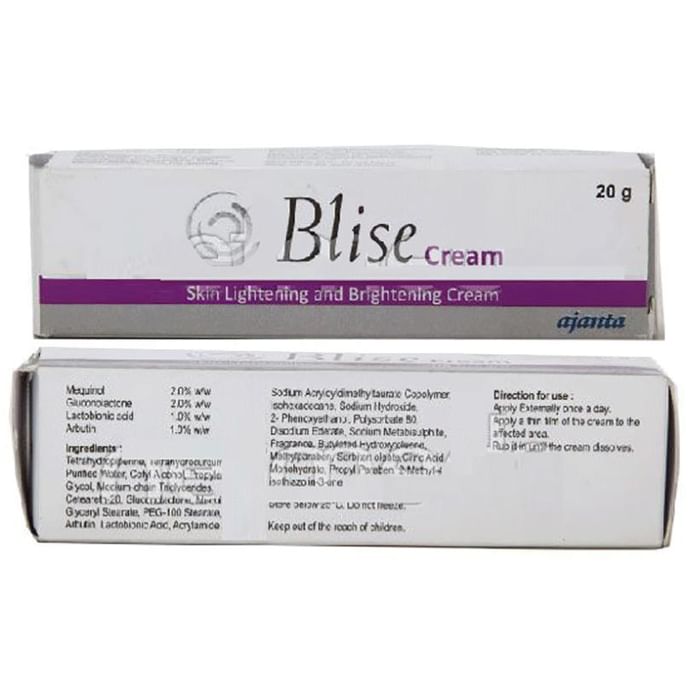 Blise Skin Lightening and Brightening Cream Blise Skin Lightening and Brightening Cream contains Aloe Vera, Gluconolactone, Lactobionic Acid and Tocopherol Acetate as main ingredients. Key benefits/uses of Blise Cream: - Aloe Vera has healing and anti-inflammatory properties that reduce skin inflammation - Gluconolactone is useful in preventing premature aging - Gluconolactone offers all the benefits of AHAs but it is gentle to the skin - Suitable for sensitive skin. - Used in treating Psoriasis - Helps remove Acne - Protects from sunlight Directions for use/Dosage: As directed by Physician. Indications: Rosacea treatment, Acne, Sensitive skin Safety information: - Read the label carefully before use - Do not exceed the recommended dose - Keep out of the reach and sight of children