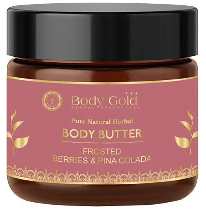 Body Gold Body Butter Frosted Berries & Pina Colada Shine with the Special Edition Piñita Colada & Frosted Berries Body Butter. Infused with a deliciously tropical summer scent and goodness of berries, shea butter and argan oil. It melts right onto the skin and locks in moisture. This rich yet lightweight cream intensely hydrates skin for 24H making it the perfect body treat. | Key Ingredients: Berries Coconut oil Argan kernel oil Peppermint leaf extract Meadfowfoam seed oil Cocoa seed butter | Key Benefits: Cocoa butter is high in fatty acids, which is why it's often touted for its ability to hydrate and nourish the skin and improve elasticity Argan kernel oil is most commonly used as a skin moisturiser to hydrate and soften the skin Berries are a good source of vitamin C and E. They're also an excellent antioxidant, which is critical to help rejuvenate the skin Coconut oil improves skin barrier function and contains anti-inflammatory properties, fights the signs of skin ageing and repairs the skin This GMP certified body butter is free from sulphate, paraben and chemicals | Directions For Use: Use as directed on the label. | Safety Information: Please note that natural skin care and hair care and body care is extremely subjective. Our products contain oils and butter from natural nuts, seeds and fruit. If you have any allergies please read the product label carefully We recommend that people perform a patch test first to ensure there is no reaction Discontinue if irritation occurs Keep out of the reach of children stored in a cool and dry place
