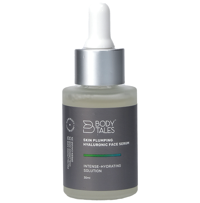 Body Tales Skin Plumping Hyaluronic Face Serum It is a lightweight facial serum formulated with hyaluronic acid, aloe vera extract and other ingredients that revitalise and rejuvenate the skin. Hyaluronic acid hydrates and moisturises your skin and reduces pigmentation, dark spots and blemishes. It boosts surface hydration and prevents fine lines and wrinkles. | Key Ingredients: Hyaluronic acid Aloe vera extract Glycerine Polyglutamic acid Green caviar | Key Benefits: It is a lightweight facial serum that revitalises and rejuvenates the skin Hyaluronic acid hydrates and moisturises your skin and reduces pigmentation, dark spots and blemishes Hyaluronic acid acts as a humectant and continues to draw moisture in from the surrounding environment It helps reduce the visibility of fine lines and wrinkles, retain moisture to the skin and create a plumping effect A combination of polyglutamic acid, hyaluronic acid and green caviar gives your face a fresh and radiant look | Directions For Use: Deeply cleanse and exfoliate your skin Take a small amount of serum in your palm With your fingertips, apply it evenly to your neck and face Massage gently into your skin using a circular upward motion Ensure complete absorption of serum for a lasting effect | Safety Information: Read the product label carefully before use Store in a cool and dry place away from direct sunlight Keep out of reach of children Conduct a patch test on your skin before proper application Do not use if the product appears to be tampered with or the seal is broken