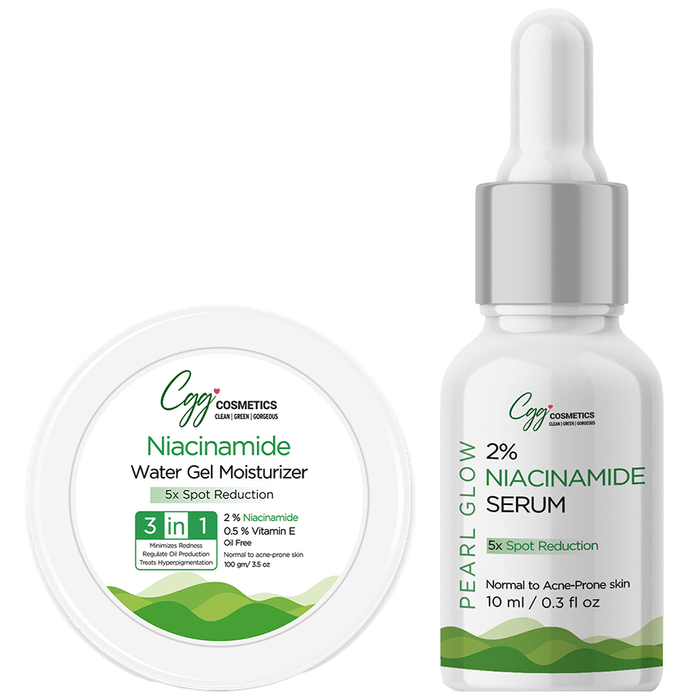 CGG Cosmetics Niacinamide Water Gel Moisturiser with Free 2% Niacinamide Serum can be effective in giving healthy, bright skin. The supplement can be beneficial in softening and smoothing the skin. The serum and the gel aid in lightening dark spots. | Key Ingredients: Niacinamide Collagen Glycerin Hyaluronic acid Siligel | Key Benefits: | Niacinamide Water Gel Moisturiser It can help improve collagen levels and electracy production of the skin It can help you enhance proper hydration by absorbing into the skin quickly The supplement helps soften and smoothen your skin It aids in assuaging the occurrence of redness and blotchiness | 2% Niacinamide Serum: It can assist in brightening the presence of dark spots and lessen their visibility The serum works toward providing an even skin tone It aids in brightening your skin, helping you enhance your natural glow | Directions For Use: As directed in the label | Safety Information: For external use only Avoid contact with eyes Avoid heat and sunlight