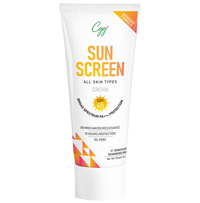 CGG Cosmetics Sun Screen Cream SPF 45 CGG Cosmetics Sun Screen Cream SPF 45 is an ultra-light sunscreen formulation with SPF 50 PA+++. It is an all-day sunscreen with once a day single application that provides sun protection for up to 10 hours. This natural sunblock gives your skin broad-spectrum protection from harmful UVA & UVB rays and pollutants as well. It is a lightweight formulation that is non-greasy. With this, you don’t have to worry about whitish, chalky skin because it has a non-streaky and non-chalky texture that does not weigh down your skin. Besides, it contains Aloe Vera that fights free radicals and prevents premature aging of your skin. The soothing properties of aloe vera also moisturize and nourishes your delicate skin. The products has a high concentration of natural actives and is pH balanced. It is dermatologically tested and free from parabens.