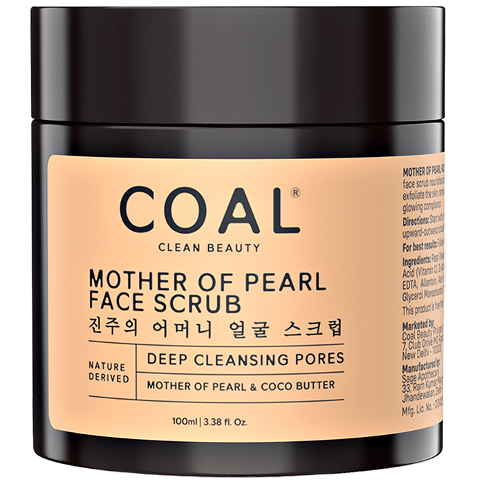 Coal Clean Beauty Mother of Pearl Face Scrub can help exfoliate the skin using Kaolin and remove oil and dead skin. Mother of pearl powder may promote healthy collagen and make the skin plump and glowing. Cucumber extract can aid in hydrating and refreshing the skin. Jojoba oil can help prevent bacterial infection by reducing the buildup of bacteria in the pores. Vitamin E may nourish and soften the skin. Both men and women can use this gel cream. It is free from toxins, parabens, and harmful chemicals. | Key Ingredients: Pearl powder Kaolin Cucumber extract Jojoba oil Olive oil Cocoa butter Shea butter Vitamin E Aloe vera gel Fragrance | Key Benefits: Mother of pearl powder has amino acids which can help produce healthy collagen and make the skin plump and glowing Kaolin works as an exfoliator by drawing out impurities from the pores of the skin and may prevent pore clogging Kaolin can remove excess oil, impurities, and other pollutants which damage the skin Cucumber extract has refreshing properties which may hydrate and soothe the skin from itchiness Jojoba oil is a humectant which can help retain moisture by sealing the skin with a protective layer Jojoba oil may keep the skin hydrated and supple and prevent bacterial infection Vitamin E has antioxidant, moisturising, and nourishing properties Vitamin E may help soften the skin, prevent moisture loss, and make the skin smooth and healthy | Directions For Use: Gently massage the scrub on moist forehead, cheeks, nose, and chin until completely absorbed Wash off the scrub & pat dry Use 2-3 times a week and follow with a face mask | Safety Information: For external use only Store in a cool and dry place Keep away from children Discontinue use immediately in case of skin irritation