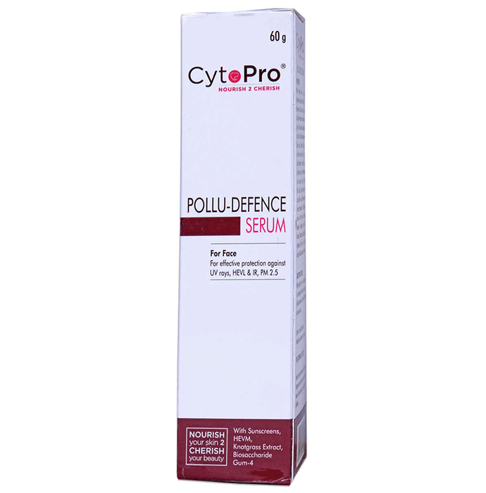 Cytopro Pollu-Defence Serum for Face Cytopro Pollu-Defence Serum for Face protects the skin from air pollution (particulate suspended matter PM 2.5) and harmful substances in the environment, protects from the damaging UV rays from the sun, IR-rays, and high energy visible light and thus offers holistic protection from damaging high energy rays and harmful pollutants in the air.