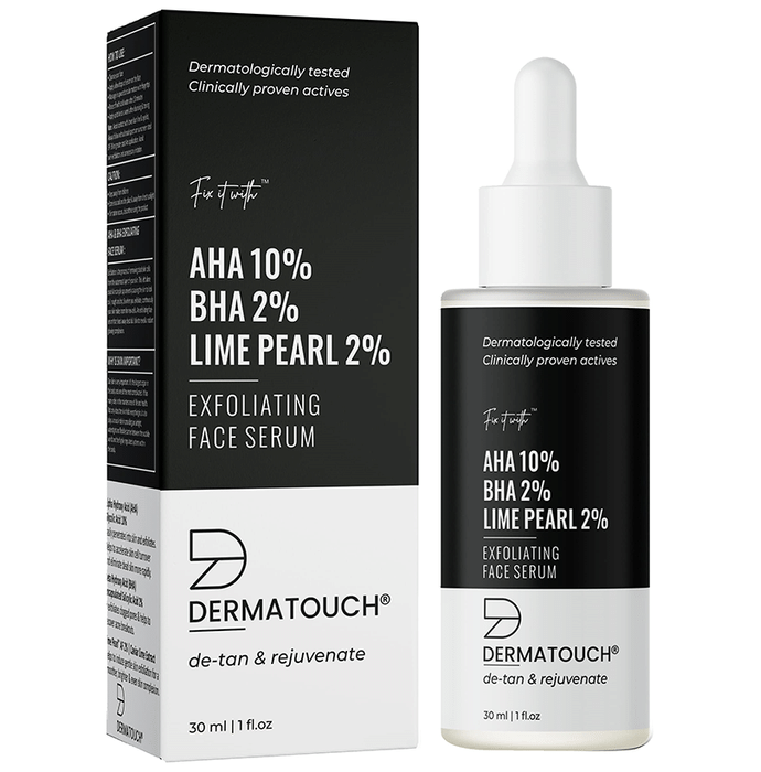 Dermatouch AHA 10% BHA 2% Lime Pearl 2% Exfoliating Face Serum is a dermatologically tested serum with clinically proven actives. This serum is gentle and helps in exfoliating built-up layers of tanned dead skin to reveal brighter skin. The blend of AHA and BHA in this non-pore clogging exfoliator sheds the dead skin cells and works deeper on pores and dirt. Lime pearl being a natural form of AHA, exfoliates and improves the skin to give a brighter and even complexion. | Key Ingredients: Glycolic acid Encapsulated salicylic acid Lime pearl AF | Key Benefits: Lime pearl is a natural source of AHA that helps to smoothen, brighten and even the skin tone It helps to eliminate dead and dull skin to leave the skin glowing and radiant Helps to reduce the appearance of large pores and detoxifies the skin Accelerates skin cell turnover, which slows down according to your age Supports in reducing sun damages and appearance of pigmentation Formulated using clinically proven actives, these products are gentle on the skin and are dermatologically tested | Directions for use: Cleanse your face Squeeze out a few drops of the serum on your face Gently massage your face in an upward circular motion Rinse off with cold water after 10 mins with a cleanser Apply up to twice a week Avoid contact with lower lash line and eyelids Always follow with a broad-spectrum sunscreen rated SPF 30 or greater, post-AM application | Safety Information: For external use only Keep out of the reach of children Store in a cool and dry place Read the label carefully before use