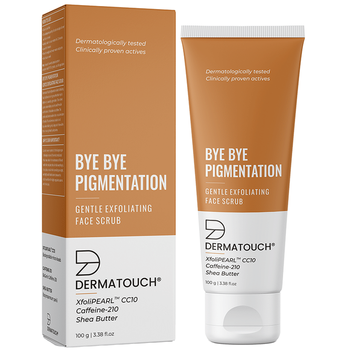 Dermatouch Bye Bye Pigmentation Gentle Exfoliating Face Scrub has de-tanning properties that helps to lighten skin caused by pigmentation. This nutrient packed scrub exfoliates, firms and nourishes skin with the blend of shea butter and caffeine. This gentle scrub hydrates and maintains natural moisture of the skin. This scrub removes dead cells and tan, while exfoliating and pulling out dirt from within the skin leaving it healthy and tan-free. | Key Ingredients: Caffeine-210 Shea butter XfoliPearl CC10 | Key Benefits: Caffeine helps in scrubbing away dead skin cells and reduces tan to leave the skin smoother Shea butter keeps the skin hydrated and moisturised. It also helps to reduce inflammation and redness This scrub helps to nourish, contour and smoothen uneven skin Helps in skin stimulation for glowing, clear and revived skin complexion Helps in limiting production of free-radicals which damage skin cells Formulated using clinically proven actives, it is gentle on the skin and are dermatologically tested | Directions for use: Cleanse your face Take adequate quantity of scrub and apply all over wet face and neck Gently scrub in circular motions for 2-3 minutes Leave for 5 minutes. Rinse thoroughly with warm water and pat dry Use it twice a week Note: Always follow with a broad-spectrum sunscreen rated SPF 30 or above, post AM application | Safety Information: For external use only Keep out of the reach of children Read the label carefully before use Store in a cool and dry place