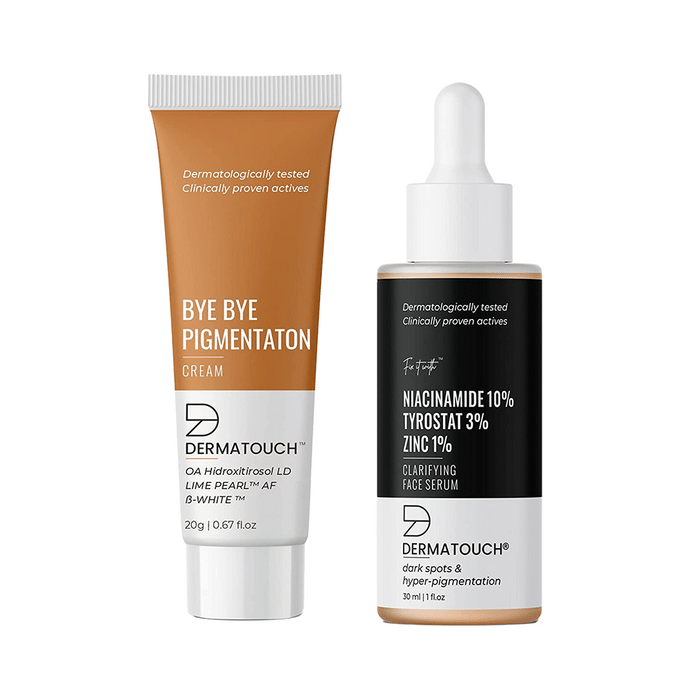 Dermatouch Combo Pack of Bye Bye Pigmentation Cream and Niacinamide 10% Tyrostat 3% Zinc 1% Clarifying Face Serum This pack contains the Dermatouch Clarifying Face Serum and Dermatouch Bye Bye Pigmentation Cream. | Dermatouch Clarifying Face Serum This face serum is gentle on the skin and is developed by dermatologists who are passionate about developing effective skincare products. The serum is formulated based on fast action, cleanse + formula. It helps to keep the skin clear, firm and healthy. | Dermatouch Bye Bye Pigmentation Cream Dermatouch Bye Bye Pigmentation cream is dermatologically tested and infused with clinically proven actives that are effective to lighten pigmentation and dark spots. This non-greasy cream gives intense nourishment to the skin and effectively helps to reduce hyperpigmentation, blemishes and age-spots on the skin. With continuous usage of cream, skin texture may be enhanced and an even toned skin can be achieved. | Key Ingredients: | Dermatouch Clarifying Face Serum Niacinamide Tyrostat Zinc PCA | Dermatouch Bye Bye Pigmentation Cream Lime Pearl AF OA Hidroxitirosol LD B-White | Key Benefits: Niacinamide is an effective skin lightening agent that contains properties to protect the skin against sun damage Zinc helps to reduce the excessive secretion of sebum and has antioxidant properties, relieving inflammation and preventing acne formation B-white helps to give a progressive brightening effect for a more clear and even skin complexion It helps to prevent melanin synthesis, blemishes, age spots and results in even skin tone Intensely nourishing formula that helps to hydrate, soften and enhance the skin texture | Directions for use: Cleanse your face Squeeze a few drops of clarifying serum on the face and gently massage till it get completely absorbed Apply Bye Bye pigmentation cream after the application of serum Use twice a day Note: Always follow with a broad spectrum sunscreen rated SPF 30 or above, after AM application | Safety Information: For external use only Keep out of the reach of children Store in a cool and dry place Read the label carefully before use