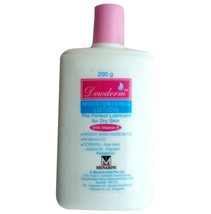 Dewderm Moisturising Lotion Dewderm moisturizing Lotion has several ingredients such as Mineral oil, Glycerine, Stearic acid, sorbitol, Aloe Vera leaf extract, Jojoba oil, Sunflower oil, Tocopherol etc. All the moisturizing agents like water, Aloe Vera, and glycerin help in retaining the water on the surface of the skin by binding the water molecules. They sooths the skin, revitalises it by refreshing and giving a cooling effect. It is applied on skin rashes, sunburns, and used for reducing the dryness and redness of skin. It also helps in treating dermatitis and eczema. Use under medical supervision