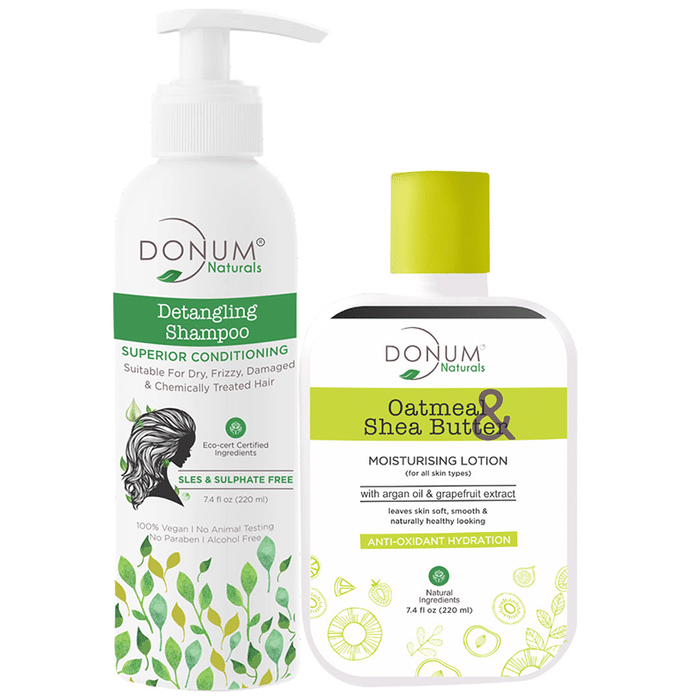 Donum Naturals Combo Pack of Detangling Shampoo and Oatmeal Shea & Butter Moisturising Lotion Donum Naturals Combo Pack of Detangling Shampoo and Oatmeal Shea Butter Lotion act as an effective anti-aging, sunscreen, natural moisturizer, natural skin brightener. This product gives you multiple benefits naturally. It provides you get natural oils and moisturize your skin with Shea butter and argan oil. It also helps sin brightening up the skin tone.